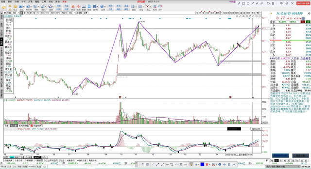 这是证券指数,讲解到这,然后看一下今天走的最好的东吴证券。现在证券大家可以感受的到每天都在换股,所以短期的操作难度是非常大的。