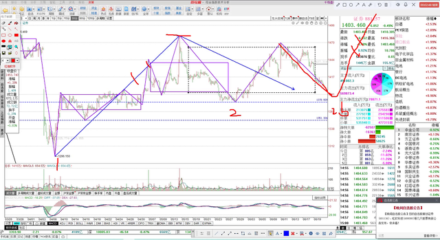这里看日线球一笔下跌,这一笔下跌支撑位还是在前面中轴下一步,在这里简单给大家标注一下就是一千三百六十九点,大概是在这个位置附近,在这个位置去等待机会。现在是三十分钟跟日线都是下跌结构,目前下跌整体来说是没有结束的,一千三百五十二点。